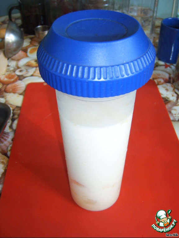 • Затем подготовить сливочно-яичную (омлетную) смесь, посолить. Я взбиваю омлет в "тапперовской" приспособе. Со сливками получается вкуснее, но с молоком тоже неплохо.