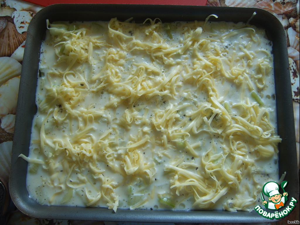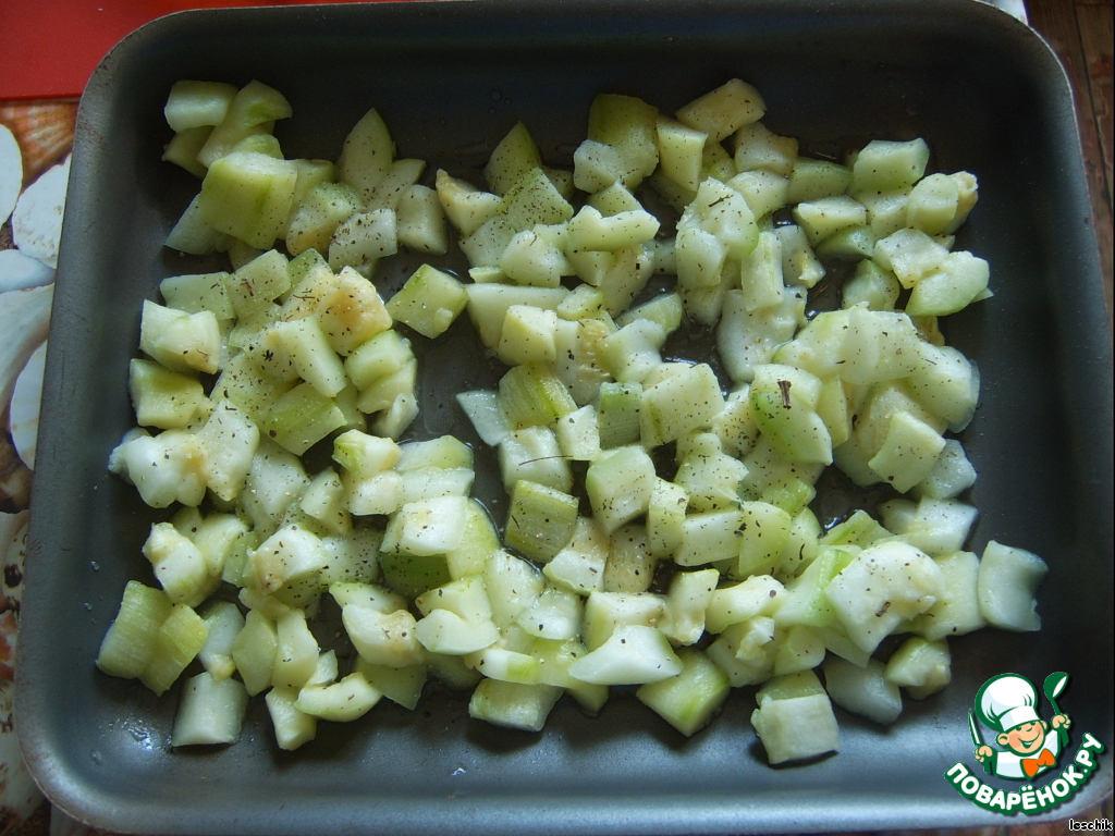 • Выложить подготовленный кабачок в противень, смазанный маслом, посыпать специями, которые любите. В оригинальном рецепте это были: перец и мускатный орех.