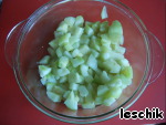 • Кабачки нарезать кружочками или кубиками (как нравится). Отварить до полуготовности, тщательно слить воду. У меня кабачок был замороженный, поэтому поставила его, не размораживая, минут на 10 в микроволновку.
