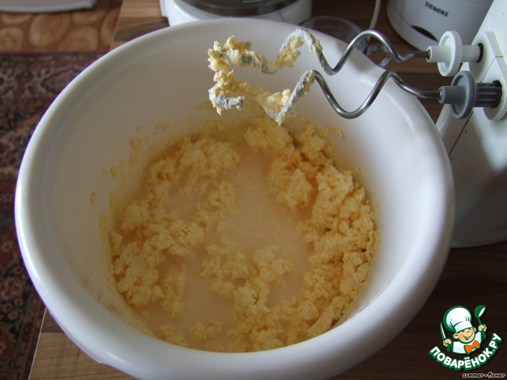 Добавляем разрыхлитель и муку, замесить не очень крутое тесто.