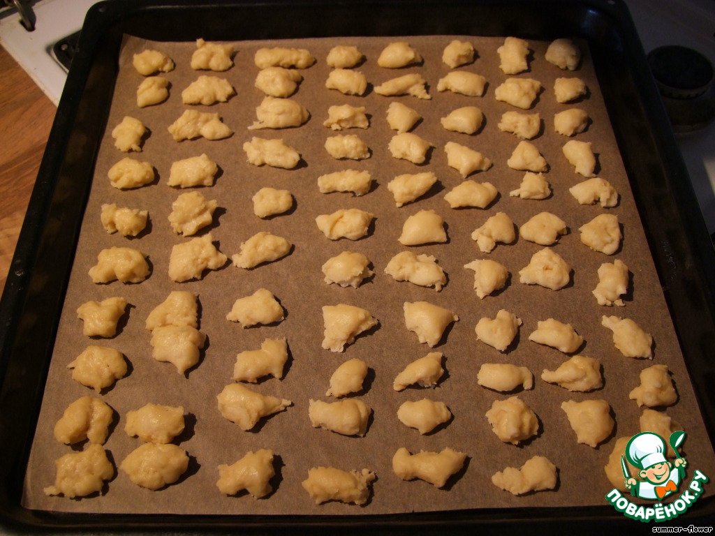 Противень застилаем бумагой для выпечки. Охлажденное тесто рвём на маленькие кусочки и выкладываем на противень. Ставим в разогретую до 180 градусов духовку, выпекаем до золотистого цвета (15-20 минут).
