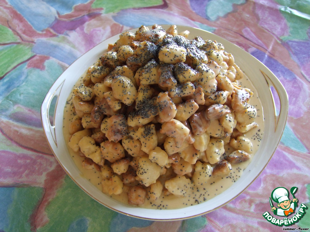 Выложить горкой на блюдо. Можно посыпать маком. Дать торту пропитаться в течение 4-5 часов.
