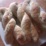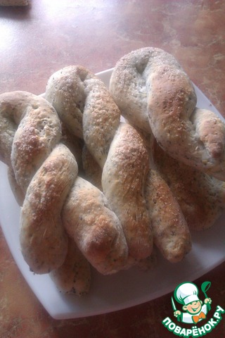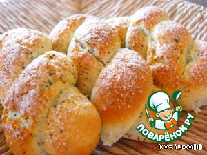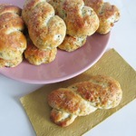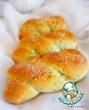Каждый шарик раскатать в колбаску и "заплести" косичку. Противень застелить бумагой для выпечки, выложить косички, смазать молоком и посыпать сахаром.