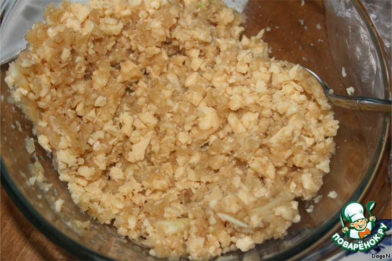 Сыр натереть и смешать с луком и яблоком, посолить.
