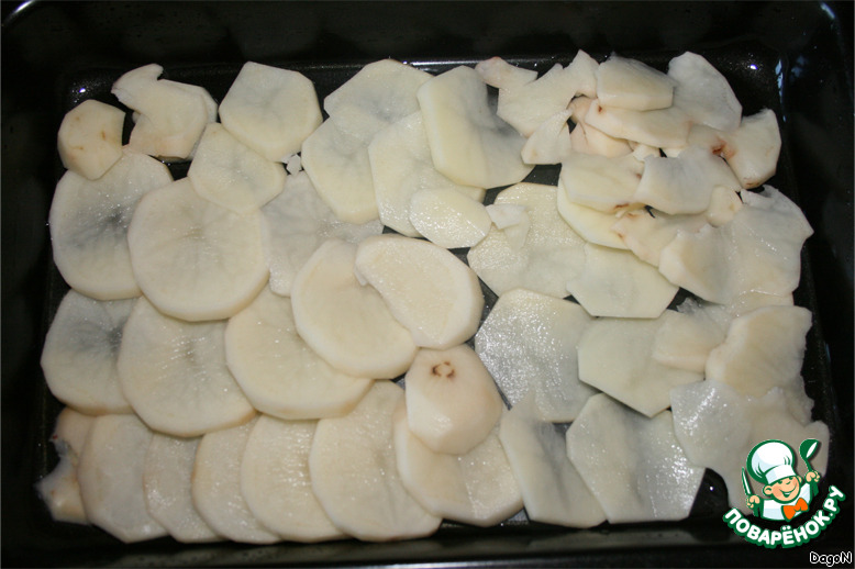 Картофель очистить, нарезать кружочками и выложить тонким слоем на противень, посолить.
