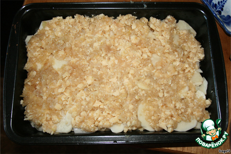 На слой картофеля выкладываем яблочно-луково-сырную смесь. Чередуем слои, последним должен быть картофель.