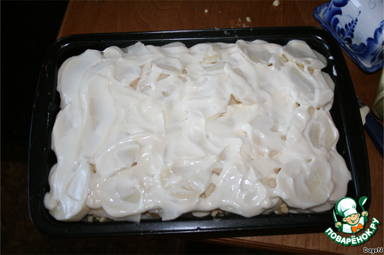 Смазываем майонезом и отправляем в духовку, разогретую до 250 градусов, примерно на 60 минут.