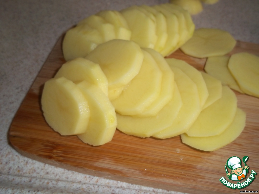 Для начала нам нужно порезать баклажаны пластинками менее 1 см ( можно кружками), посыпать солью и оставить минимум на 30 минут. Тем временем режем картофель кружками, тоже тонко.