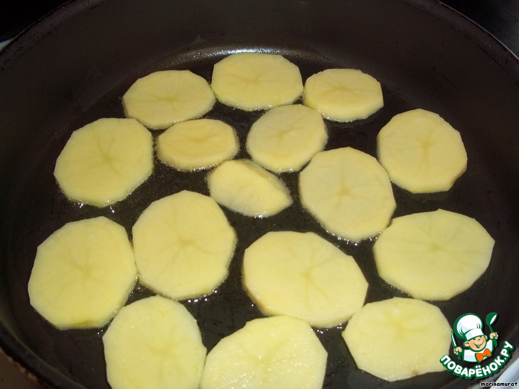 Обжариваем картофель с каждой стороны до полуготовности (в целом минуты 3). Выкладываем на салфетку, чтоб убрать лишнее масло. Это первый слой нашей мусаки.