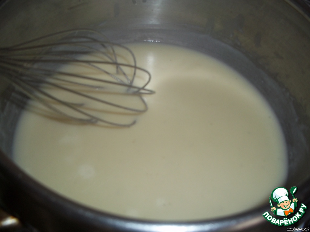 Готовим соус бешамель. В небольшой кастрюле разогреваем сливочное масло и кладем туда муку, мешаем, пока масса не загустеет. Начинаем понемногу добавлять теплое молоко. Добавили грамм 30 и хорошо перемешали, чтоб оно все впиталось в мучную смесь, потом снова, и так раз 5-6, пока не закончится все молоко. Венчиком стараемся размешать соус, чтоб не оставалось комков. Варим на небольшом огне около 4 минут до загустения, солим, перчим и оставляем на плите остывать.