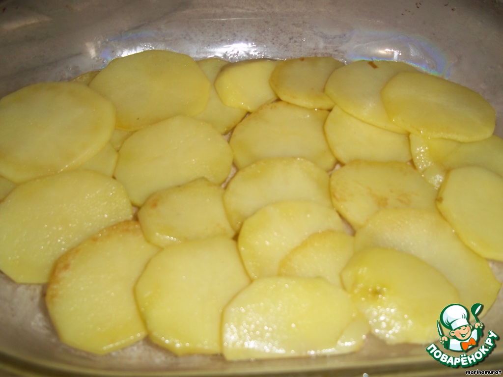 Собираем мусаку. Смазываем форму маслом, слегка (у меня оливковое). Кладем картофель внахлест и прижимаем руками; не забываем каждый слой посыпать солью.