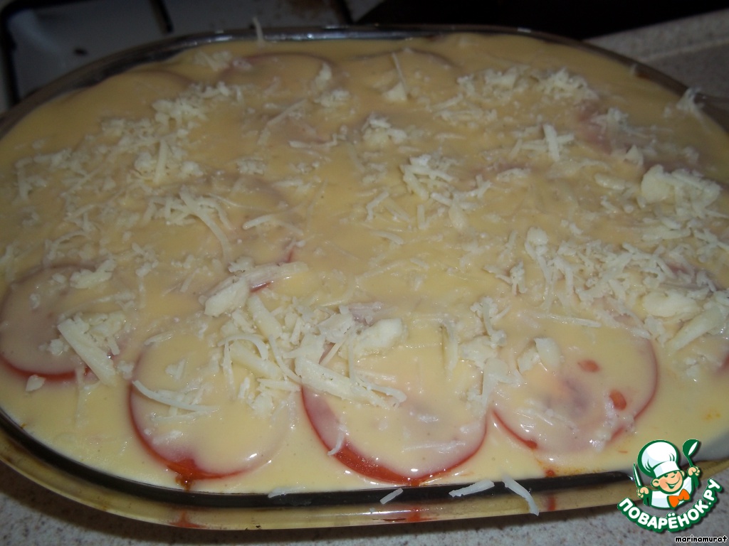 Наш соус к этому времени остыл и загустел. Надо добавить в него яйца (чтоб легче было вмешивать яйцо в соус, разбейте их в тарелочку и добавляйте понемногу к соусу, каждый раз хорошо вмешивая). Готово. Заливаем мусаку и лопаточкой разравниваем, чтоб соус покрыл все блюдо полностью. Сверху посыпаем сыром и в разогретую до 200 градусов духовку на 40 минут.