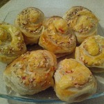 Теперь наши рулетики выкладываем на смазанный маслом (можно застелить пекарской бумагой) противень. Сверху смазать желтком.