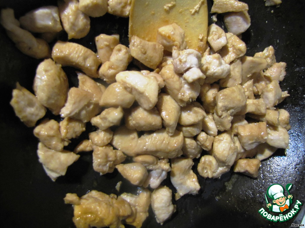 Сначала нарежем на кусочки куриную грудку и обжарим на небольшом количестве масла до легкого золотистого цвета. В процессе жарки добавим соевый соус и 1 зубчик измельченного чеснока. |
