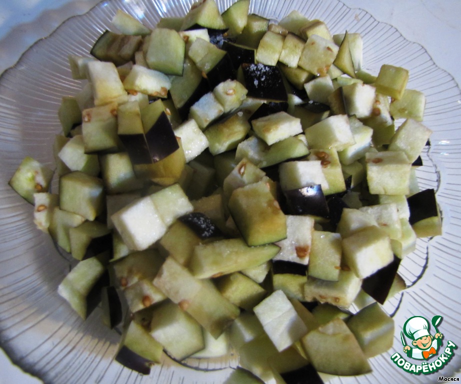Баклажан нарежем кубиками, присолим и отавим минут на 10-15, чтобы стекла горечь. |