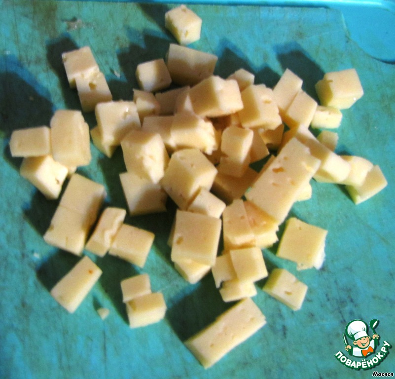 Сыр тоже нарезаем кубиками. В этом салате хорошо будет сочетаться нежный сыр (в идеале - моцарелла). |
