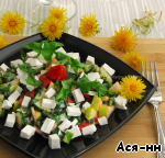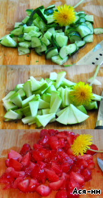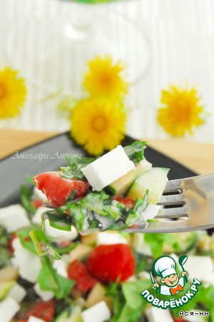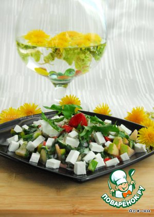 Легкий и сочный салатик с листьями одуванчика и клубникой. Большое спасибо Нине (Desert rose) за помощь с названием, оно появилось после общения на форуме.