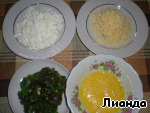 Брынзу, сыр (оставьте немного для посыпания), яйца, щавель с луком смешайте, добавьте щепотку мускатного ореха, свежемолотый перец и соль по необходимости. Я соль не добавляла, так как брынза у меня была соленая.