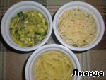 Сверху на гнезда равномерно распределите заливку, присыпьте сыром, который вы оставили.