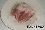 Мякоть свинины обмазать подсолнечным маслом и обильно посыпать перцем. Оставить мариноваться на 20-30 минут.