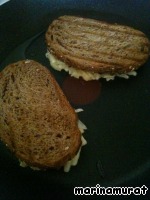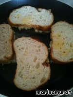 На сковороде разогреваем 1 ст. л. масла и кладем бутерброды начинкой вниз.