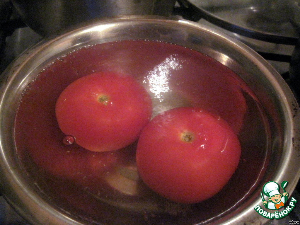 Помидорки помещаем на минуту в кипяток, вытаскиваем и снимаем шкурку