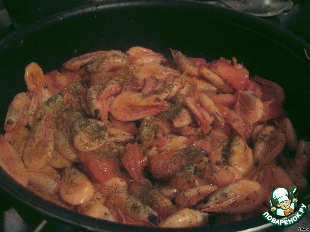 Добавляем измельчённый чеснок и жарим ещё 5мин., затем добавим нарезанные кубиками помидорки и обжариваем всё минут 10 (помидоры практически растворяются), соль по вкусу, хорошо бы добавить свежий укроп, но у меня был только сухой. Далее я выложила часть креветок, а в оставшуюся часть добавила острый красный перец (сухой) и совсем чуть масла, минуту помешала... готово!