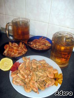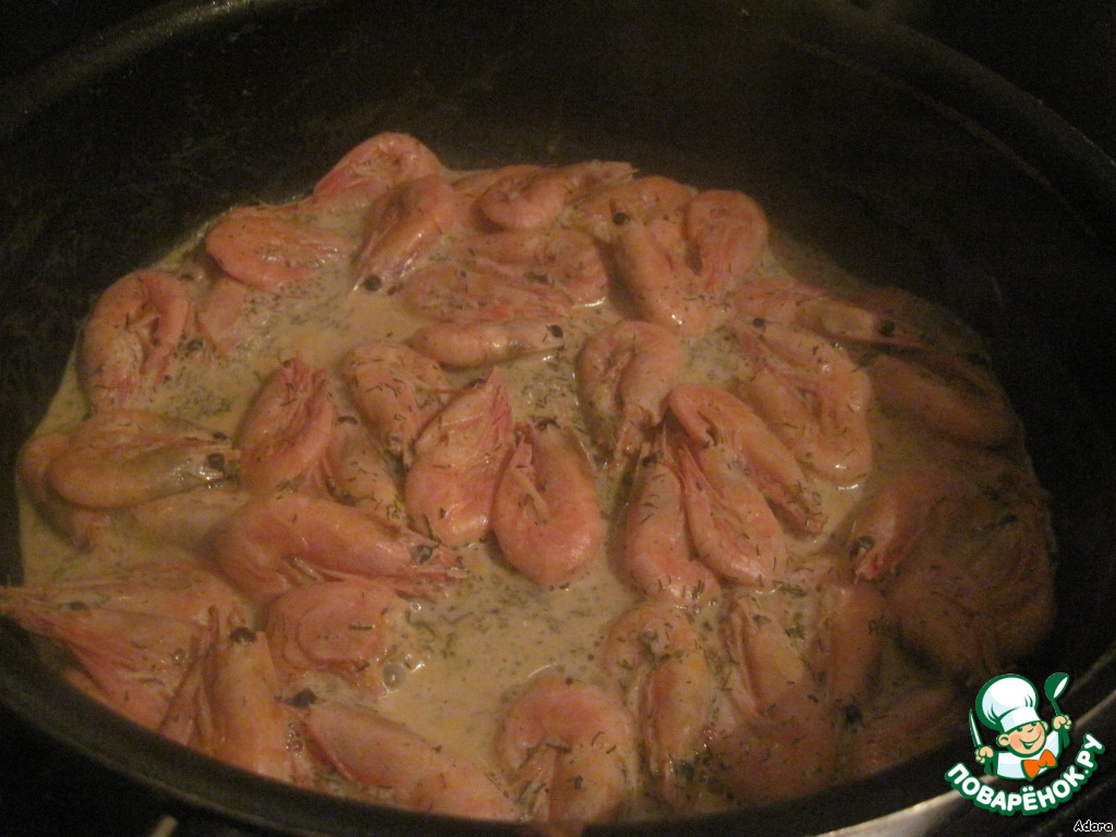 Обмываем сковороду и выкладываем вторую часть креветок, вода испарилась, залили сметанно-лимонным соусом, накрыли крышкой и оставили минут на 10-15 на маленьком огне... выложили в тарелку (я полила дополнительно соком второй половины лимона)