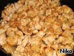 Обжарить филе и лук до румяного цвета.