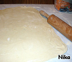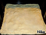 Тесто разделить на две части и тонко раскатать. Осторожно, скалкой перенести на противень.