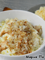 Яйца и сыр натереть на мелкой терке, добавить жареный лук с чесноком, отжатый хлеб. Посолить и поперчить. Тщательно перемешать.