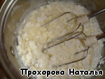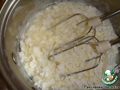 Крем остудить и охладить. Затем вбить миксером в крем творог и крахмал.