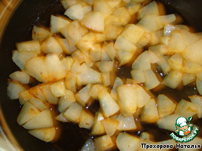 Груши нарезать небольшими квадратиками. И обжарить на сливочном масле с 2 ст.л. сахара, карамелизировать.