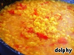Добавьте бульон и воду, помидор и чечевицу. Доведите до кипения.
