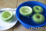 Яблоки вымыть, срезать верхушку и аккуратно вынуть сердцевину и часть мякоти, оставив по краям примерно 1 см. Чтобы яблоки не потемнели, опустить их в подсоленную воду.