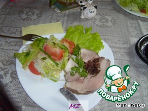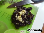 Замариновать филе свинины (у меня была своя приправа из сладкого перца, помидоров и зелени сельдерея), поставить на ночь в холодильник. Утром достать и дать постоять, чтобы мясо стало комнатной температуры. Нарезать чернослив, выдавить прессом чеснок.
