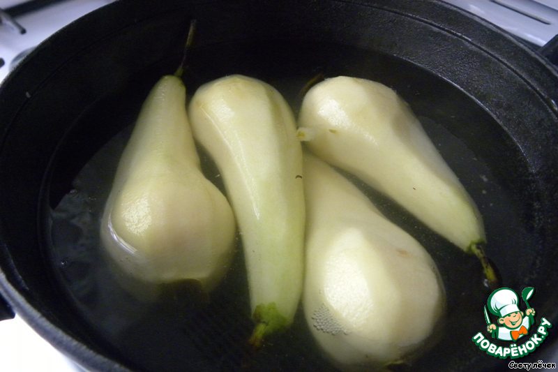 Груши чистим от кожицы и отвариваем в сиропе 10 мин.