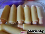 Отварить листы лазаньи в горячей воде до состояния альденте (полуготовности). Завернуть сосиски в лист лазаньи.