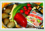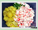 Ингредиенты для салата - картофель, сельдерей, зелёный лук, редис, чеснок, болгарский перец, крабовая масса.