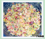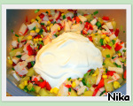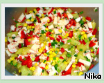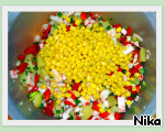 Я решила, что не хватает яркости, и добавила кукурузу. Очень люблю её в салатах. Она придаёт салату сочность, сладость и красоту.