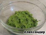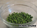 Замороженный или свежий зеленый горошек обдать кипятком. Если он мягкий, то достаточно. Если нет, как у меня, то сварить до мягкости.
