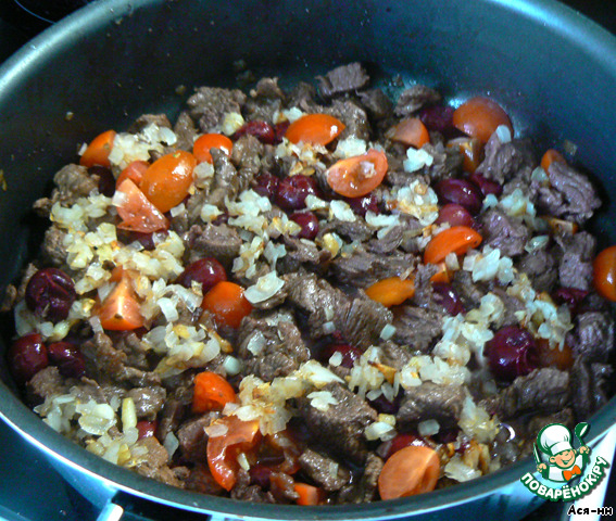 Когда сок из мяса почти выпарится, отправляем к нему разрезанные на четвертинки помидоры черри и вишню, перемешиваем и убавляем огонь.