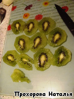 Очистить киви от кожуры. Нарезать тоненькими кружочкам. Нам необходимо 8 кружочков.