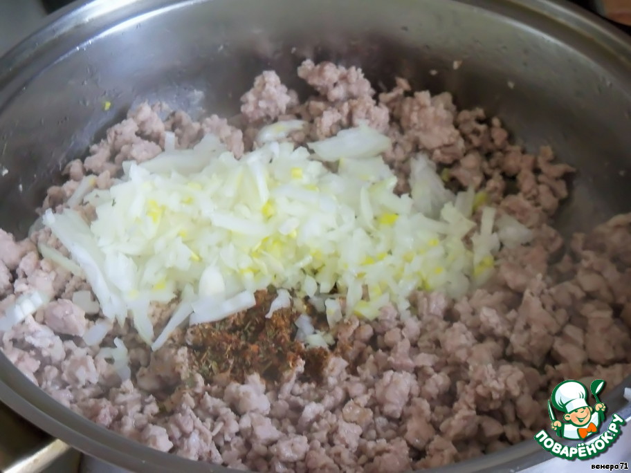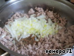 Обжарить фарш на растительном масле. Добавить мелко нарезанный лук, положить соль, перец, специи.