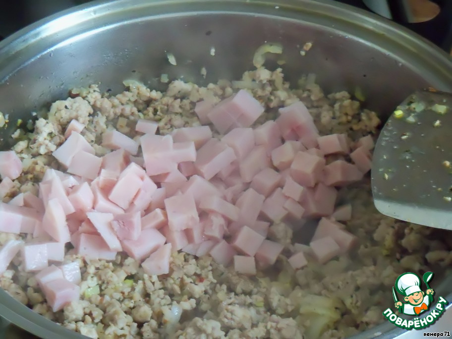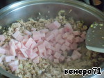 Далее добавить мелко нарезанную ветчину, обжарить 2-3 минуты.