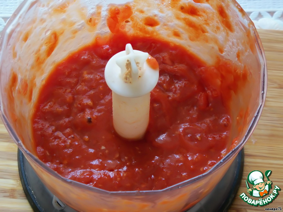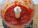 С помидора снять кожу, прокрутить в блендере, добавить томатную пасту.