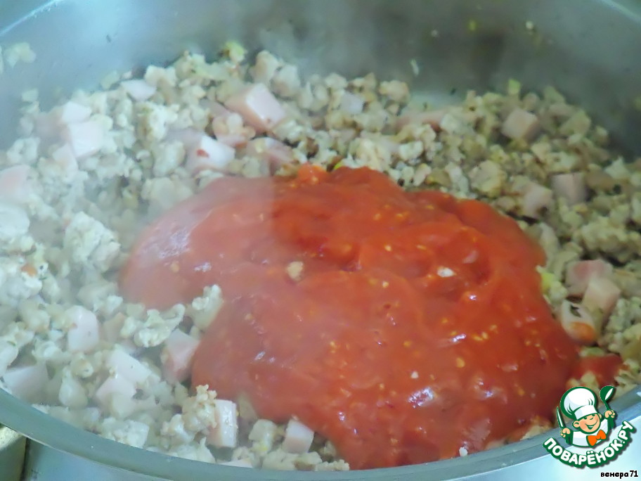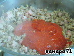 В фарш добавить томатное пюре и потушить под крышкой 2-3 минуты.