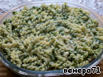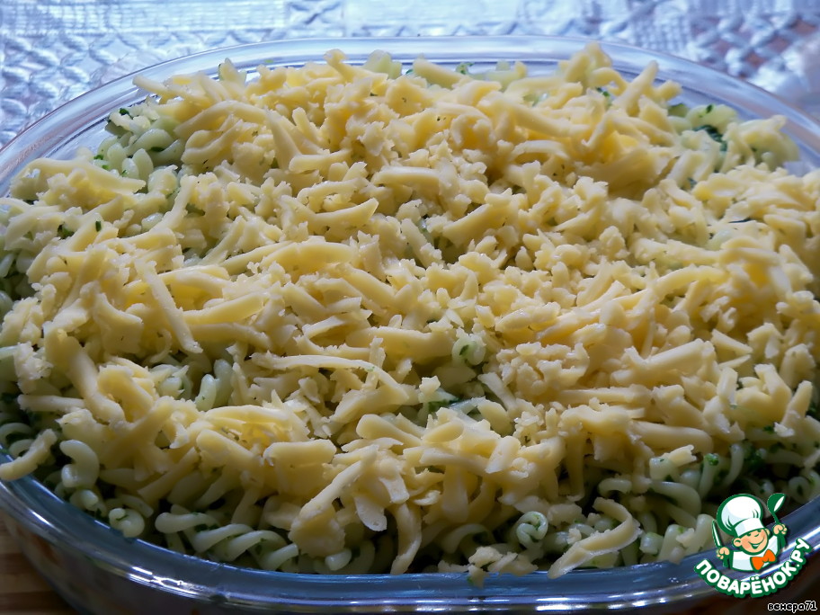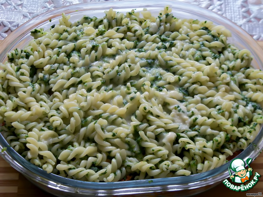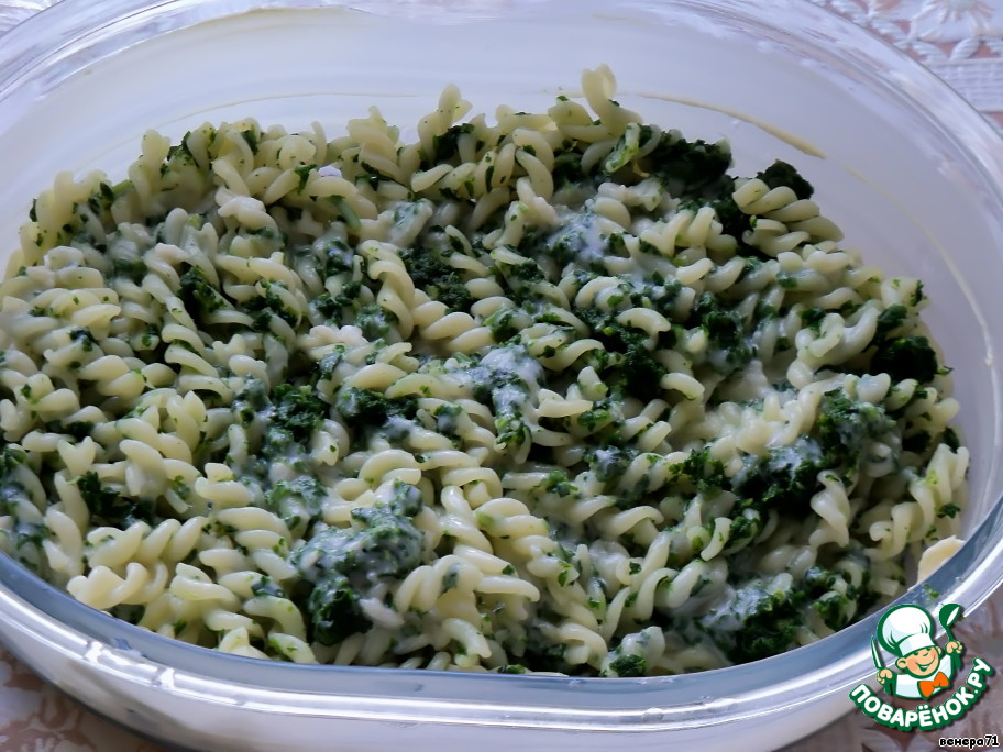 Шпинат перемешать с макаронами. Половину выложить в смазанную маслом форму для запекания. Полить немного соусом бешамель. -
