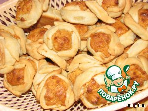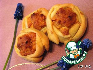 Формируем лепешечку, делаем надрезы с четырех сторон, оставляя серединку нетронутой. На середину выкладываем начинку. -