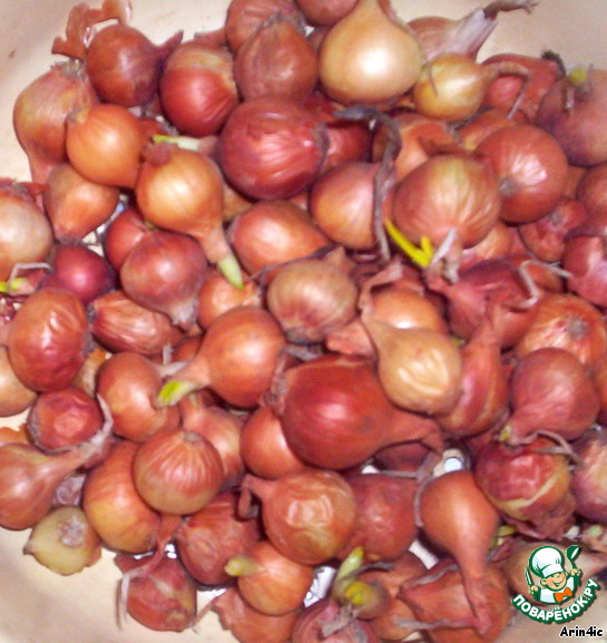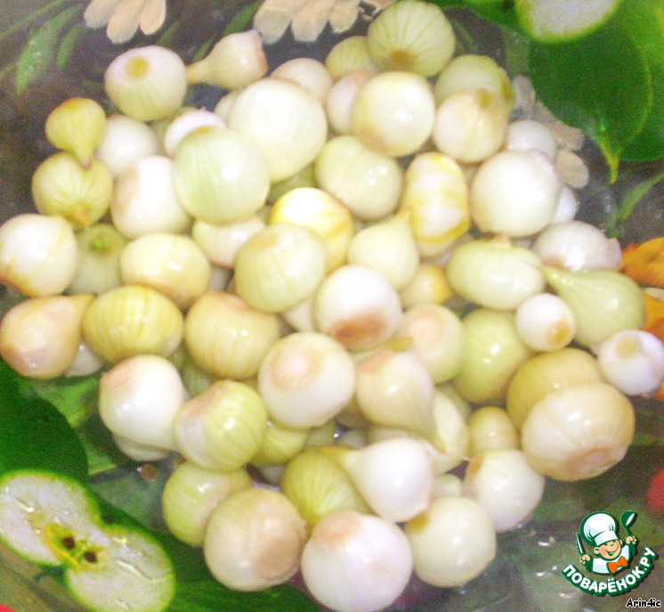 Сейчас на рынках продают лучок на посадку. Можно его посадить, а можно сделать превосходную закуску. Великолепно подходит для салатов. Маринованный во фруктовой кислоте лук получается нежным и сладковатым. Источник рецепта - интернет.
